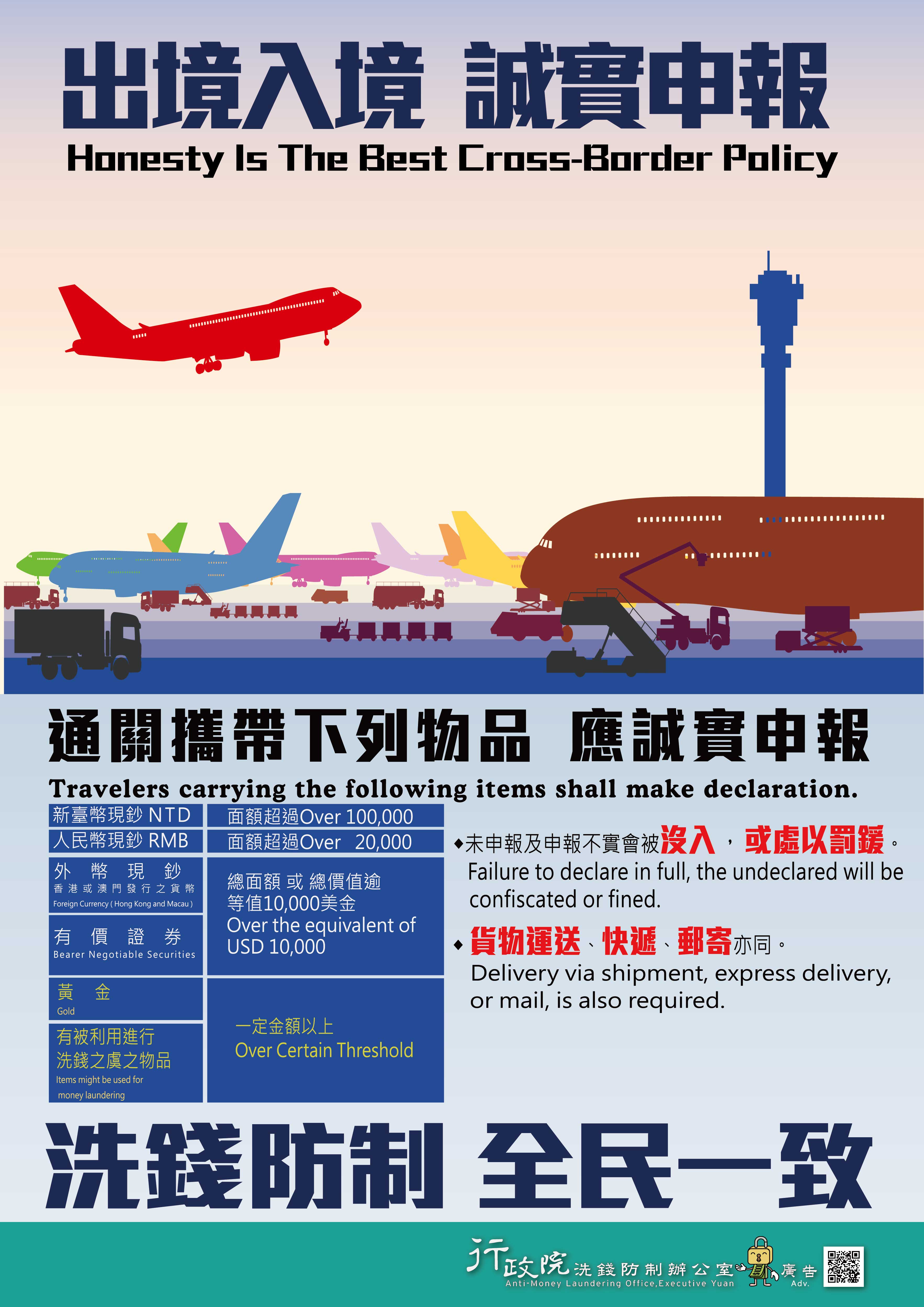 3.出入境攜帶新台幣10萬元、人民幣2萬元、等值1萬美元之外幣、有價證券、一定金額之黃金及物品,要誠實申報,行政院洗錢防制辦公室關心您。